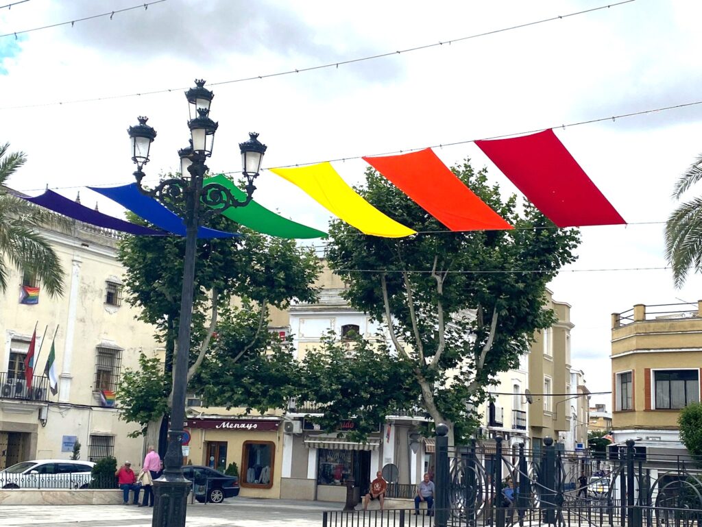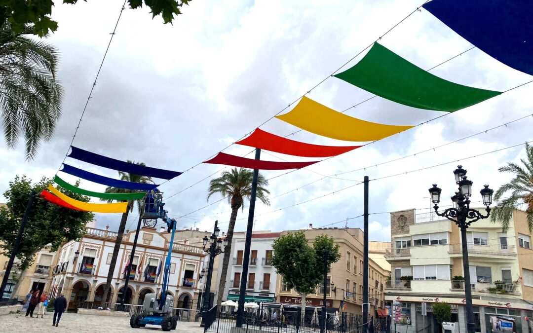 Este fin de semana se celebra “Montijo orgulloso”, una celebración a la diversidad para la que la Plaza de España se ha engalanado con la instalación de telas de colores que servirán tanto de decoración como para dar puntos de sombra.