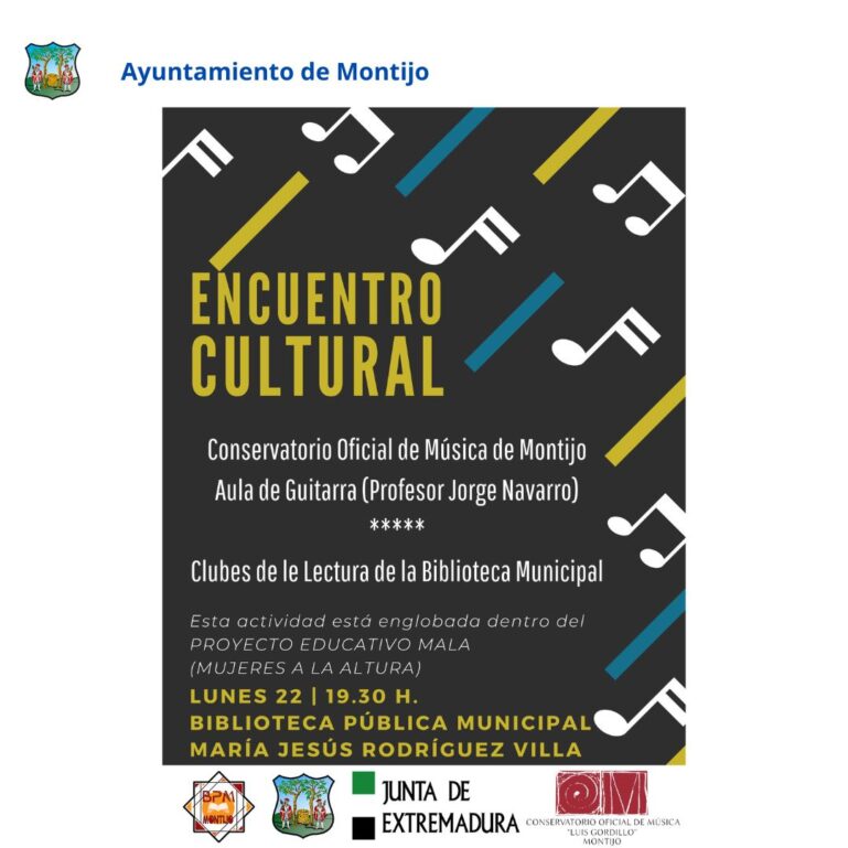 Hoy lunes, a lasl 19.30 horas se iniciarán las actividades con el II Encuentro Cultural entre los alumnos del aula de guitarra de Jorge Navarro, pertenecientes al Conservatorio Profesional de Música de Montijo y los miembros del Club de Lectura de la biblioteca.