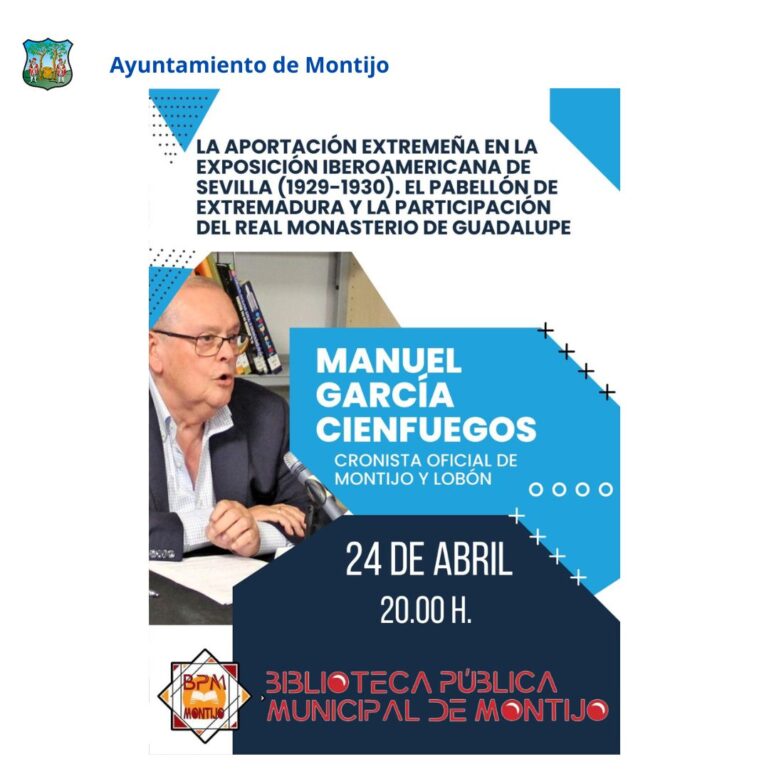 El miércoles, día 24 de abril, a las 20.00 horas, Manuel García Cienfuegos, nos ofrecerá la charla “La aportación extremeña en la Exposición Iberoamericana de Sevilla (1929-1930). El pabellón de Extremadura y la participación del Real Monasterio de Guadalupe”, un trabajo que presentó el pasado año dentro de los LII Coloquios Históricos de Trujillo y que ofrecerá una nueva visión de la exposición celebrada hace casi un siglo en la capital hispalense y de la ciudad de Sevilla en sí.