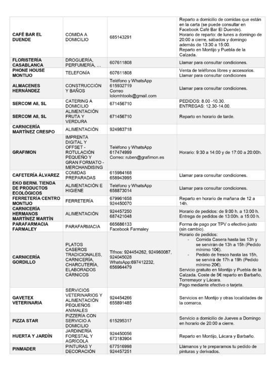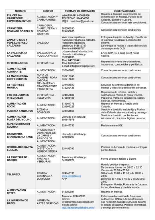 El Ayuntamiento de Montijo informa a los ciudadanos sobre las empresas que ofrecen sus servicios a domicilio en base al artículo 10 del Real Decreto 463/2020, de 14 de marzo, por el que se declara el estado de alarma para la gestión de la situación de crisis sanitaria ocasionada por el COVID-19.