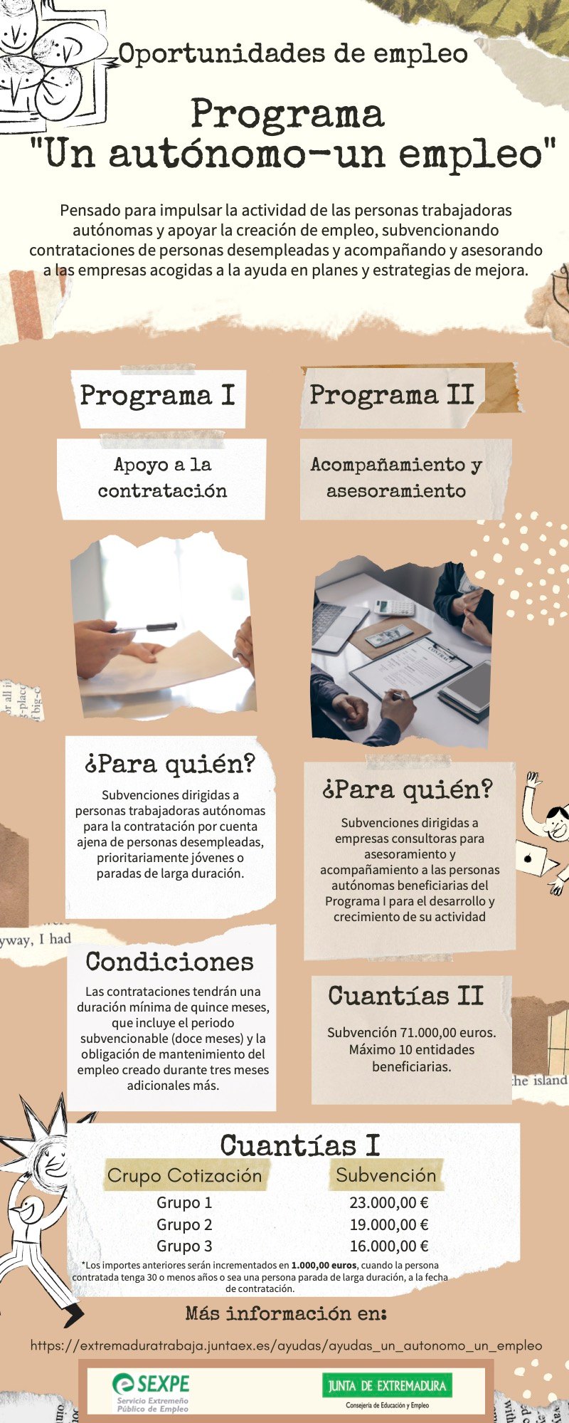 La Junta de Extremadura a través del programa “Un autónomo-un empleo” ha lanzado esta campaña de ayuda para impulsar la actividad de las personas trabajadoras autónomas y apoyar la creación de empleo, subvencionando contrataciones de personas desempleadas y acompañando y asesorando a las empresas acogidas a la ayuda en planes y estrategias de mejora.
