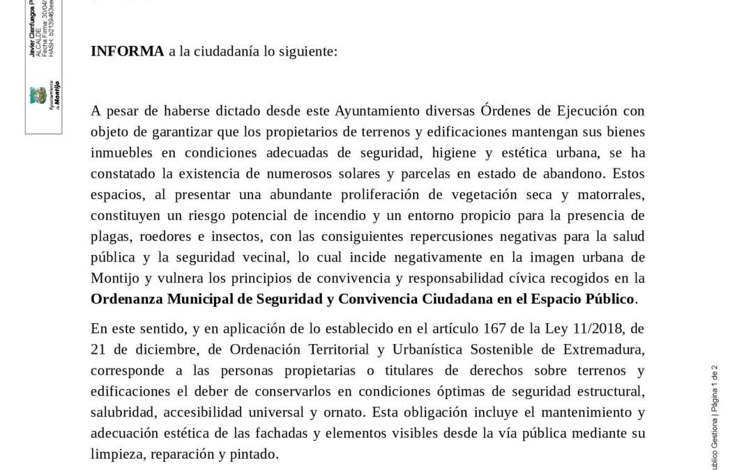 A pesar de haberse dictado desde este Ayuntamiento diversas Órdenes de Ejecución con objeto de garantizar que los propietarios de terrenos y edificaciones mantengan sus bienes inmuebles en condiciones adecuadas de seguridad, higiene y estética urbana, se ha constatado la existencia de numerosos solares y parcelas en estado de abandono. Estos espacios, al presentar una abundante proliferación de vegetación seca y matorrales, constituyen un riesgo potencial de incendio y un entorno propicio para la presencia de plagas, roedores e insectos, con las consiguientes repercusiones negativas para la salud pública y la seguridad vecinal, lo cual incide negativamente en la imagen urbana de Montijo y vulnera los principios de convivencia y responsabilidad cívica recogidos en la Ordenanza Municipal de Seguridad y Convivencia Ciudadana en el Espacio Público.