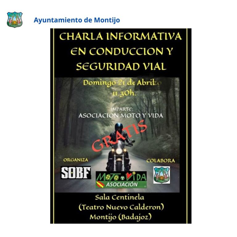 El próximo domingo, 22 de abril a partir de las 11.30 horas, la Sala Centinela del Teatro Nuevo Calderón de Montijo acogerá una charla informativa en conducción y Seguridad Vial impartida por la Asociación motera Moto y Vida.