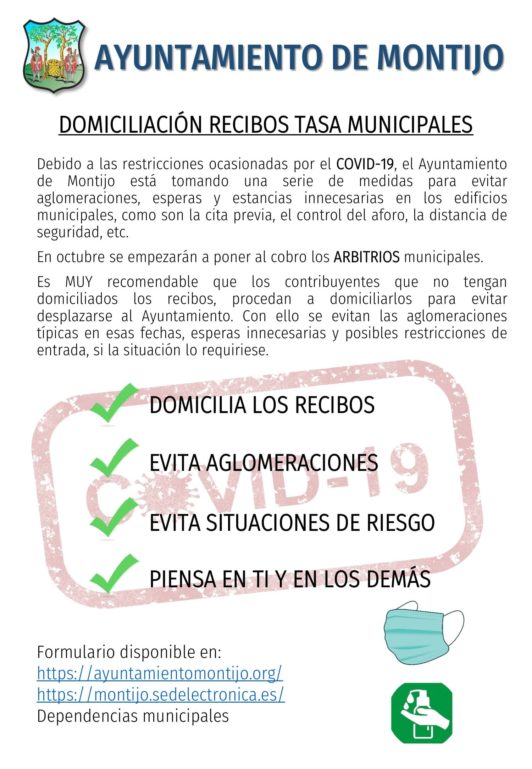 Es MUY recomendable que los contribuyentes que no tengan domiciliados los recibos, procedan a domiciliarlos para evitar desplazarse al Ayuntamiento. Con ello se evitan las aglomeraciones típicas en esas fechas, esperas innecesarias y posibles restricciones de entrada, si la situación lo requiere.