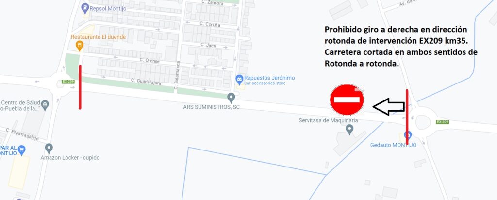En cuanto a los vehículos pesados que circulen por la EX -209 desde Badajoz deberán dirigirse a Valdelacalzada en el cruce anterior y acceder a Montijo por el cruce de Mercoguadiana  hacia Avenida del Progreso. Los que provengan de la autovía deberán continuar por la Avenida del Progreso.
