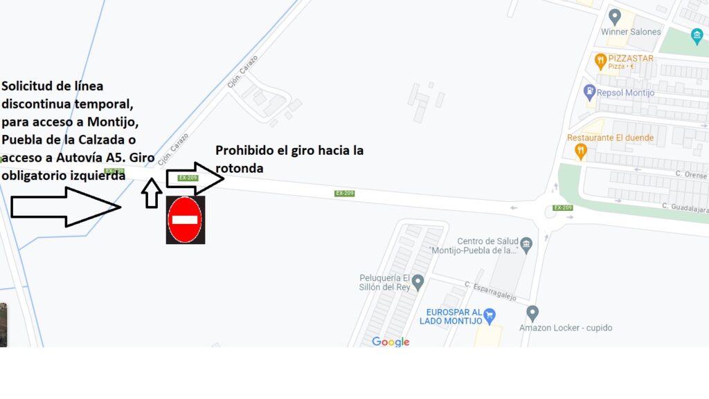 Los turismos que provengan de la carretera EX – 209 deberán acceder a la población, si vienen  desde Badajoz por la Avenida del Carazo y si vienen desde la autovía, por la Avenida de Europa. Para acceder a Puebla de la Calzada habrá habilitado un único carril en lugar de los dos habituales, uno para cada sentido en la propia rotonda.