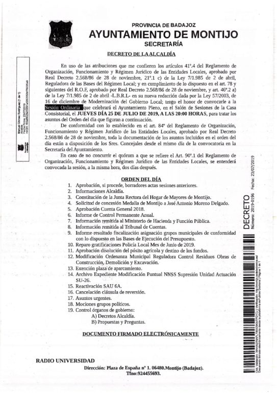 El Ayuntamiento de Montijo ha convocado el Pleno ordinario correspondiente al mes de julio que tendrá lugar el jueves 25 de julio a partir de las 20.00 horas en el Salón de Plenos del Consistorio.