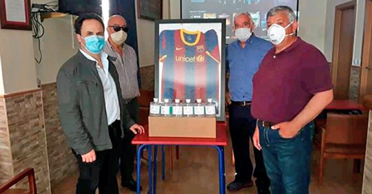 La peña de fútbol del FC Barcelona ha querido contribuir a los diferentes actos de solidaridad que vienen realizando los montijanos y montijanas con la entrega, de botes de 500 ml de hidrogel para que el consistorio los reparta según las necesidades.