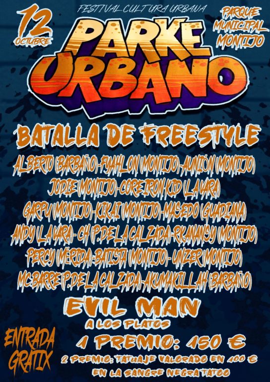 Este sábado, 12 de octubre, se celebrará en Montijo el Festival Cultura Urbana “Parke Urbano” en el Parque Municipal organizado por Alex de la Fuente junto con la Asociación Bellota Activa con la colaboración del Ayuntamiento de Montijo.