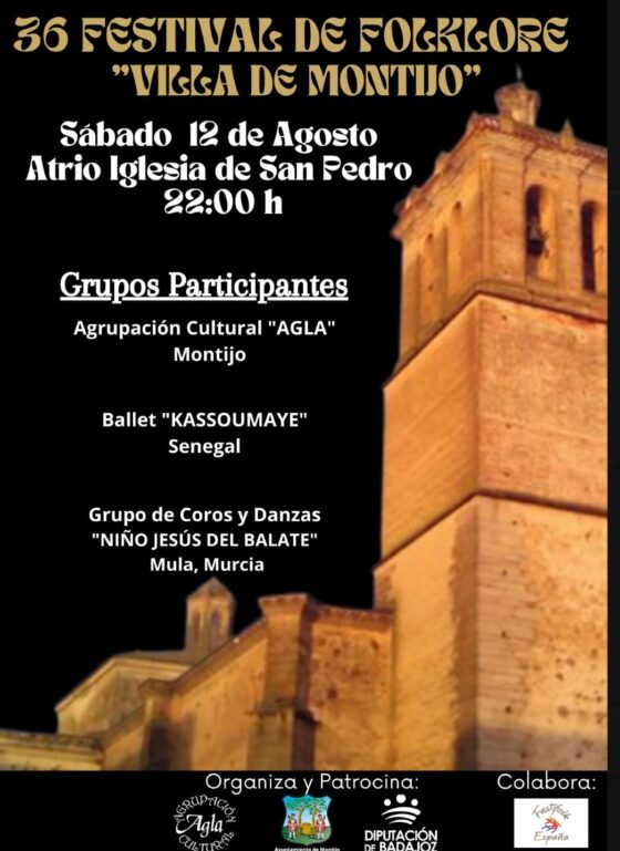 El próximo sábado 12 de agosto a partir de las 22.00 horas en el Atrio de la Iglesia de San Pedro se celebrará el Festival de Folklore “Villa de Montijo”.