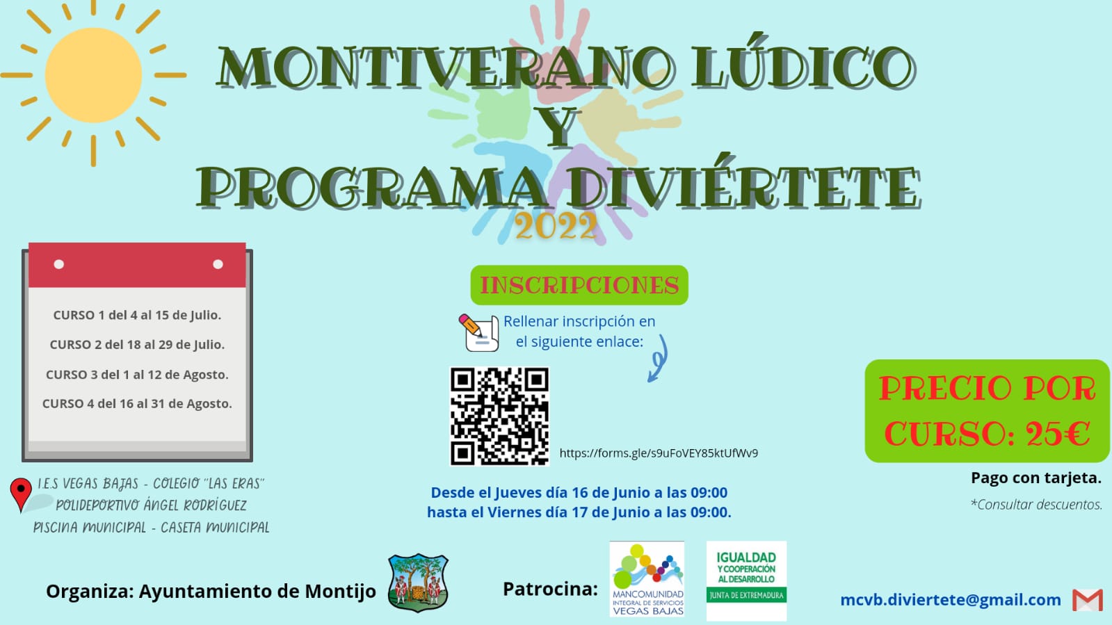 Las Concejalías de Deportes y Cultura ponen en marcha un año más ‘Montiverano Lúdico 2022’ para el disfrute de la población infantil durante los meses de julio y agosto. Desde el año pasado y debido al éxito obtenido, el sistema de inscripción es mediante formulario de Google que estará activo desde las 09.00 horas del jueves, 16 de junio a las 09.00 horas del viernes 17 de junio. Sólo durante ese periodo se podrán realizar las inscripciones. Mayor información en el siguiente enlace https://ayuntamientomontijo.es/download/montiverano-ludico-2022/