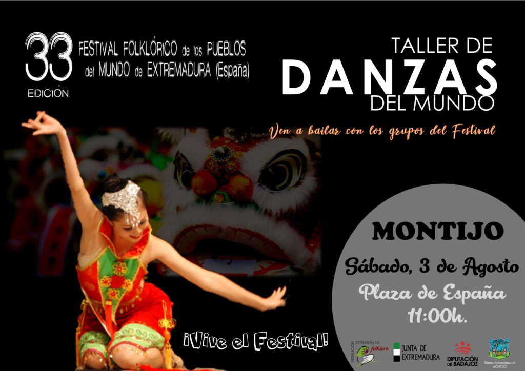 El próximo 3 de agosto, a partir de las 11.00 horas, la Plaza de España de Montijo acogerá un taller de Danzas del Mundo organizado por la Federación Extremeña de Folklore junto con la colaboración de la Concejalía de Festejos del Ayuntamiento de Montijo.