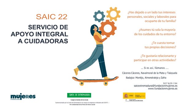 Ya tienes a tu disposición este servicio estará a disposición hasta el próximo 31/12/2022 a través del teléfono: 927 629 194 o del correo electrónico: saicextremadura@fundacionmujeres.es