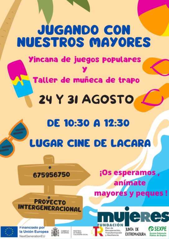 Mañana jueves, 24 de agosto y el próximo jueves, 31 de agosto, Lácara acogerá un Proyecto Intergeneracional a cargo de la Fundación Mujeres y con la colaboración del Ayuntamiento de Montijo con el objetivo de disfrutar de un dia de convivencia entre niños y mayores.