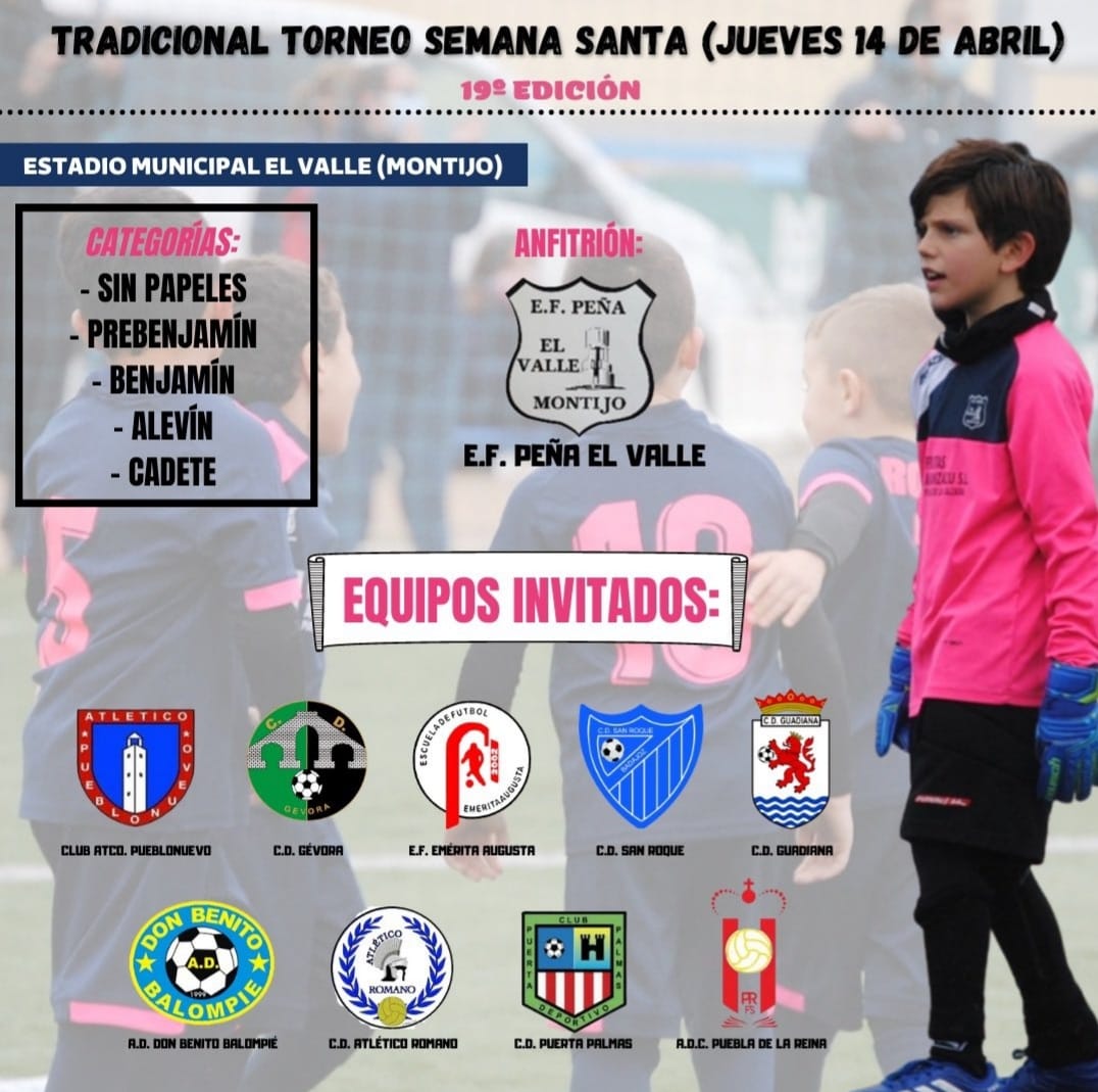 La Escuela de Fútbol Peña el Valle ha organizado como es tradicional, el Torneo de Semana Santa que tendrá lugar el próximo jueves, 14 de abril en el Estadio Municipal el Valle de Montijo a partir de las 09.00 horas.